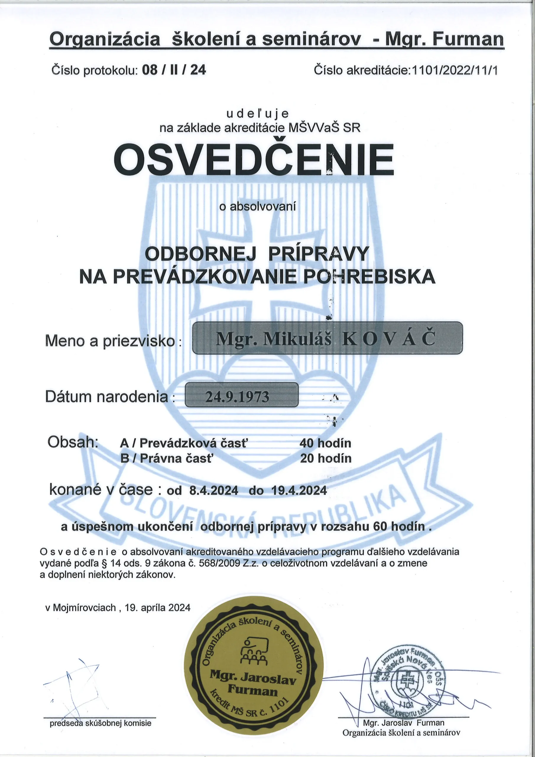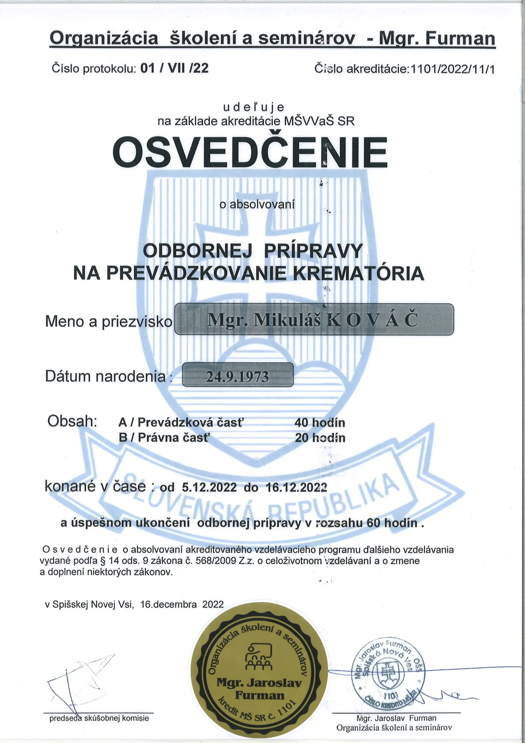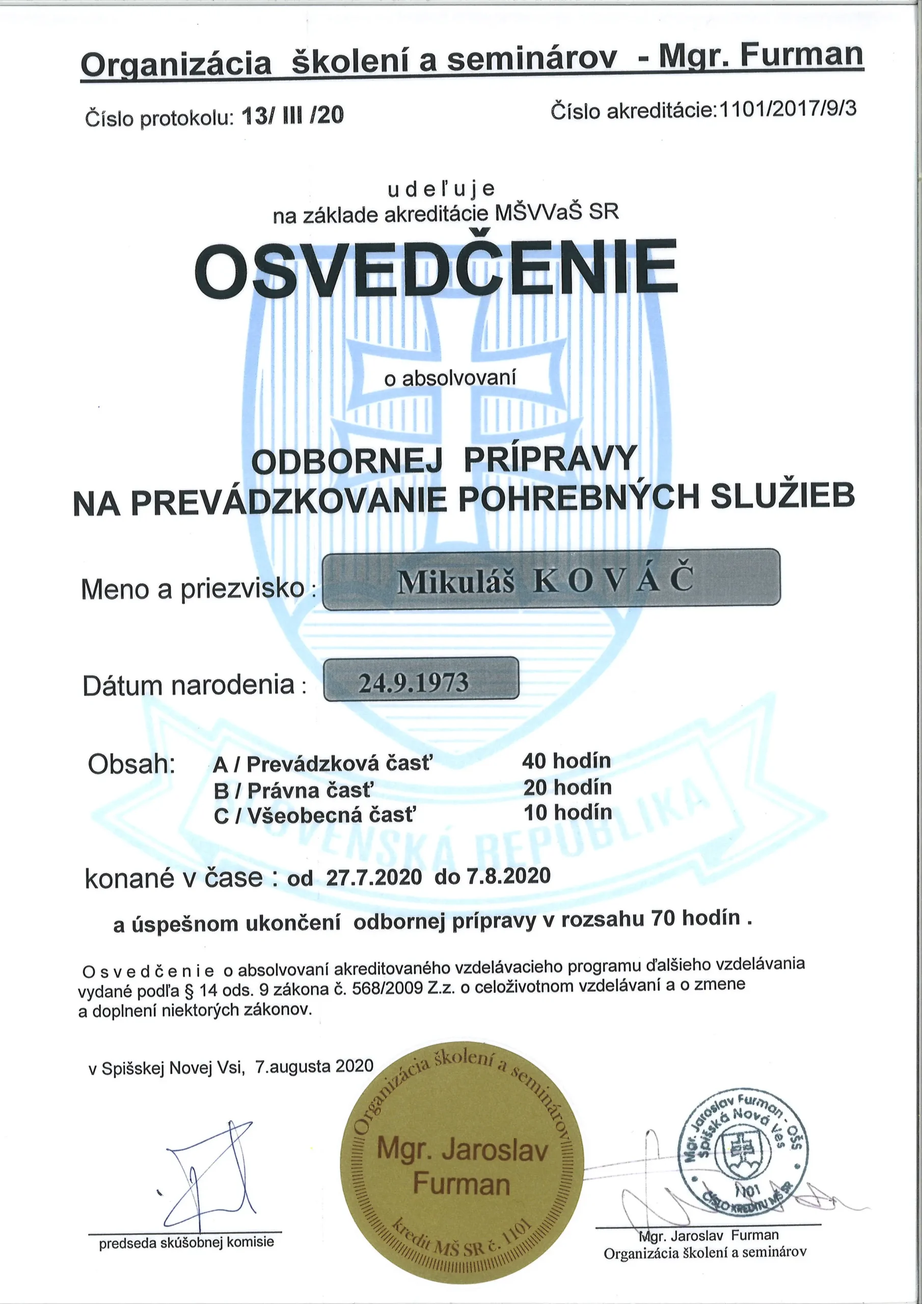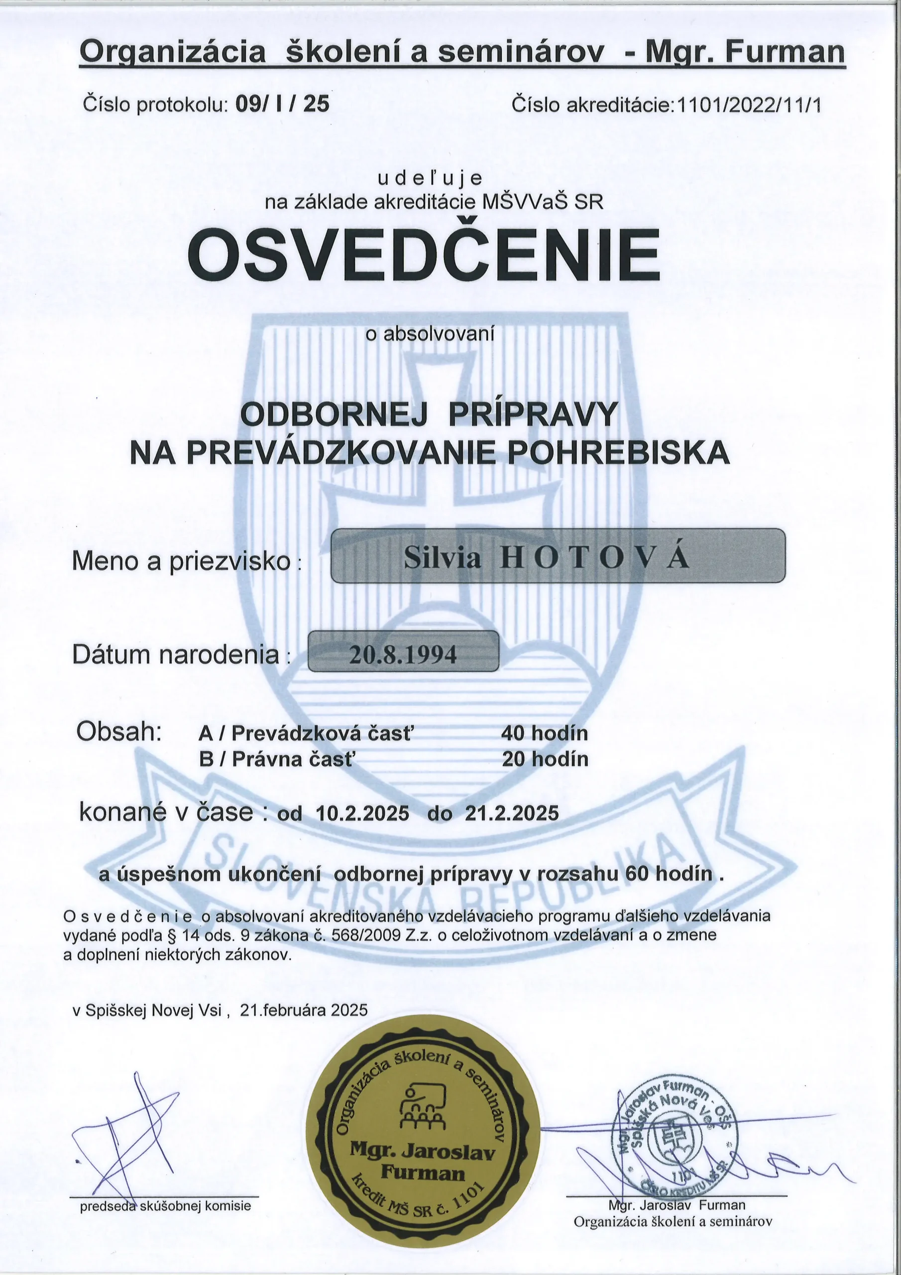 Sme certifikovaní profesionáli na základe odbornej prípravy na prevádzkovanie pohrebných služieb, na prevádzkovanie krematória a na prevádzkovanie pohrebiska.